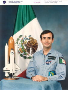 en el viaje que lo convirtió en el primer astronauta mexicano en salir de la órbita de la Tierra con el fin de apoyar en la misión de poner al Morelos II en órbita (op. cit.: 5).